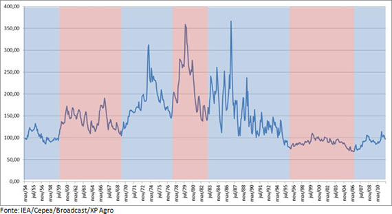 Bom, após um recuo das cotações ocorrido de 2002 ao início de 2006, época em que o produtor "reduziu a marcha", a entressafra daquele ano deu início ao atual ciclo em que nos encontramos.
